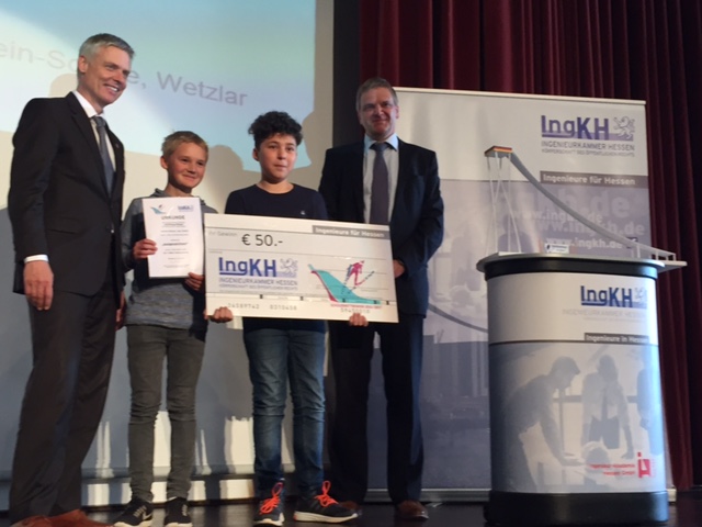 Bei der Preisverleihung am 20. April 2017 sind (fast) alle Erbauer mitgefahren mit dem Bus ging es nach Gießen in die Kongresshalle. Nach Grußworten des Staatssekretärs Dr. Manuel Lösel, dem Präsident der Technischen Hochschule Mittelhessen Prof. Dr. Matthias Willems und einem Vorstandsmitglied der Ingenieurkammer Hessen Prof. Dr. Dipl-Ing. Joaquin Diaz wurden die 10 besten Plätze in der Kategorie I (Klasse 5-8) vorgestellt.