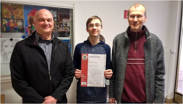 Mit Laurens freuen sich unser stellvertretender Schulleiter Herr Koschoreck und Laurens Mathelehrer Herr Dürr