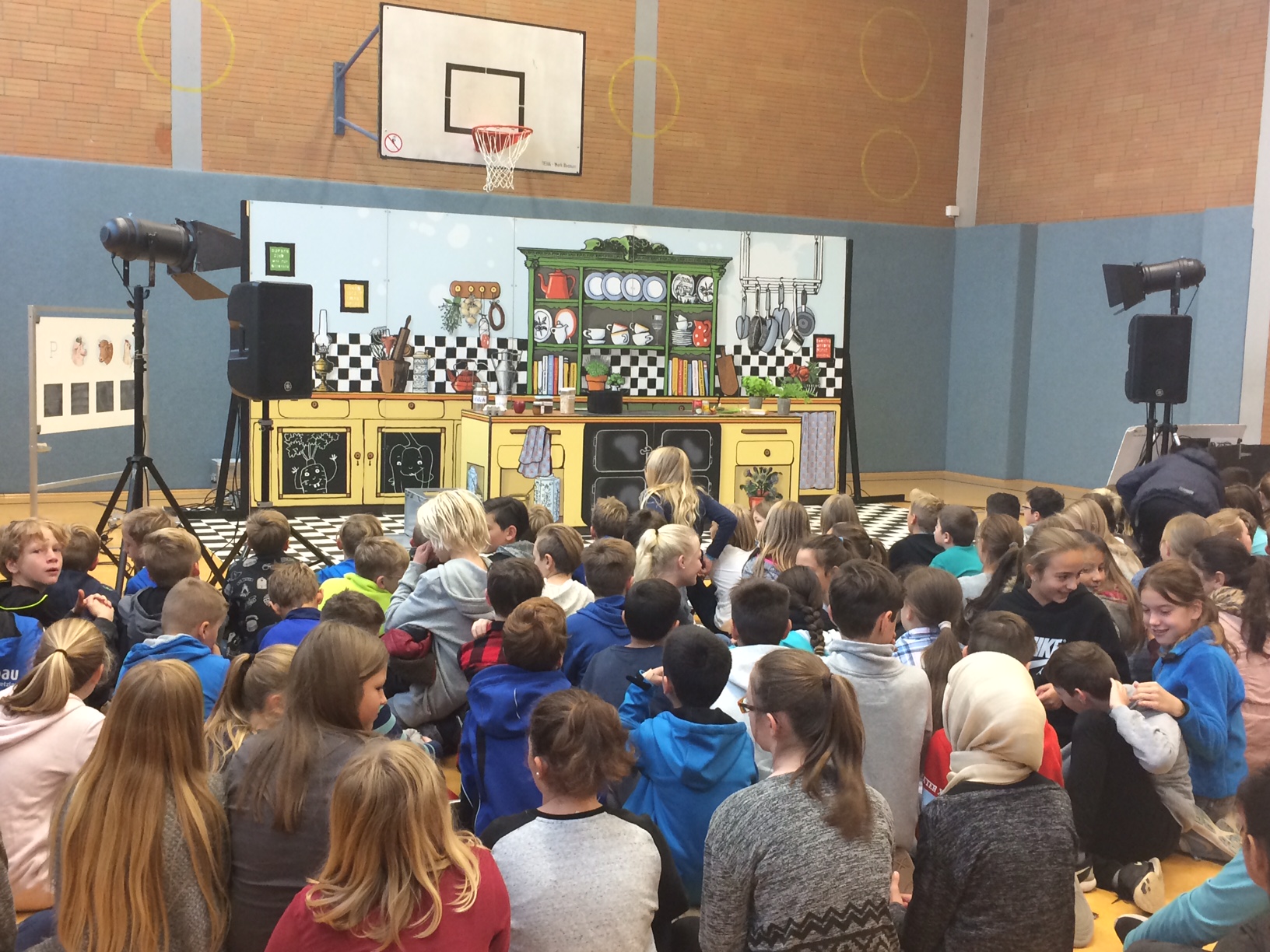 Tipps zur Ernährung und zu gesundem Essen bekamen am Mittwoch, den 20.9.2017 Schülerinnen und Schüler der Jahrgangsstufen 5 und 6 der Steinschule. Das Theater Nimmerland war mit seiner Produktion „Ein absolut irres Kochduell“ zu Gast und begeisterte die Zuschauer. Anschließend erlebten die Kinder noch einen Mitmachparcours zum Thema und alle bekamen ein Kochbuch mit Rezepten zum Mitnehmen für zu Hause!