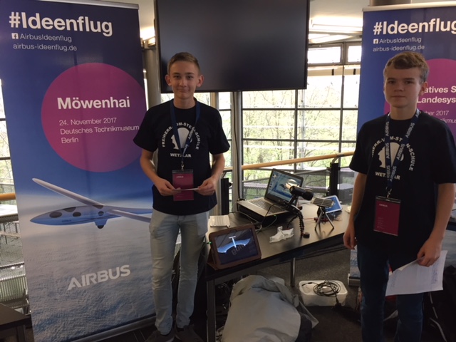 Die Airbusgroup hat im März zum 5. Mal den Wettbewerb ausgelobt. Und die beiden haben sich für die Runde der letzten 10 von 40 Teams qualifiziert. Nun haben sie am Freitag 24.11.17 ihr Projekt vor der Jury verteidigt. Neben der Ideenstärke, Kreativität und Qualität wurde auch die Präsentation vor der Jury und damit auch die Teamarbeit der beiden jungen Erfinder bewertet. Entwickelt und als 3D Video visualisiert haben Jonathan und Elias ein Segelflugzeug, dass sie aufgrund der Vorbilder aus der Natur Möwenhai genannt haben.