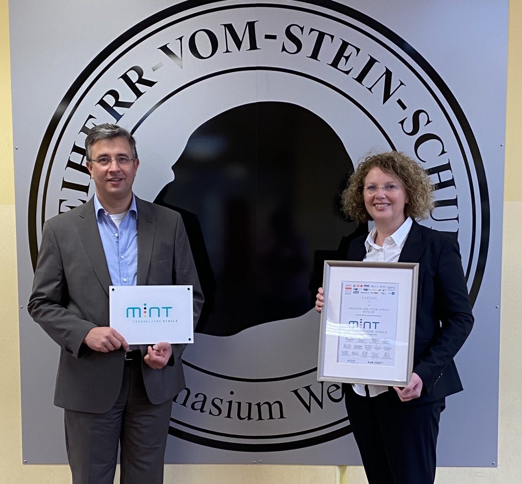 Ein großer Dank gilt dem engagierten Kollegium, das unsere Schülerinnen und Schüler für mathematische und naturwissenschaftliche Fragestellungen Phänomene begeistert. Die gute naturwissenschaftliche Ausstattung der Schule und die Weiterentwicklung des Forscherraumes haben daran einen großen Anteil. Die Kooperation mit den Unternehmen in unserer Region vervollständigen das Bild, das die Auswahlkommission bewegt hat, die Freiherr-vom-Stein-Schule als MINTfreundliche Schule auszuzeichnen.
