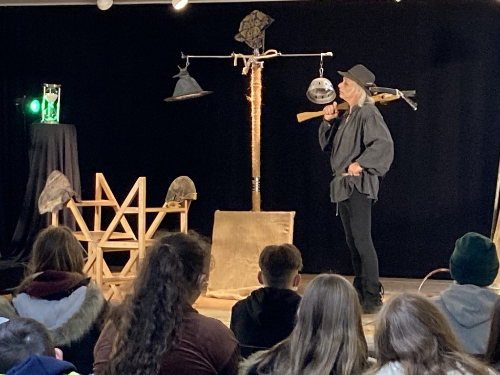 Auf Einladung der Deutschlehrerin Frau Schneider hatte Herr Ekkehardt Voigt vom „Als-ob-Theater“ aus Weinbach die Bühne des Mehrzweckraums der Schule in Schauplätze aus Friedrich Schillers meistgespieltem Drama „Wilhelm Tell“ verwandelt.