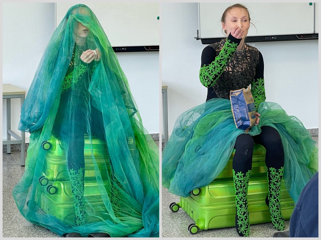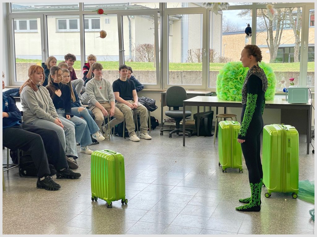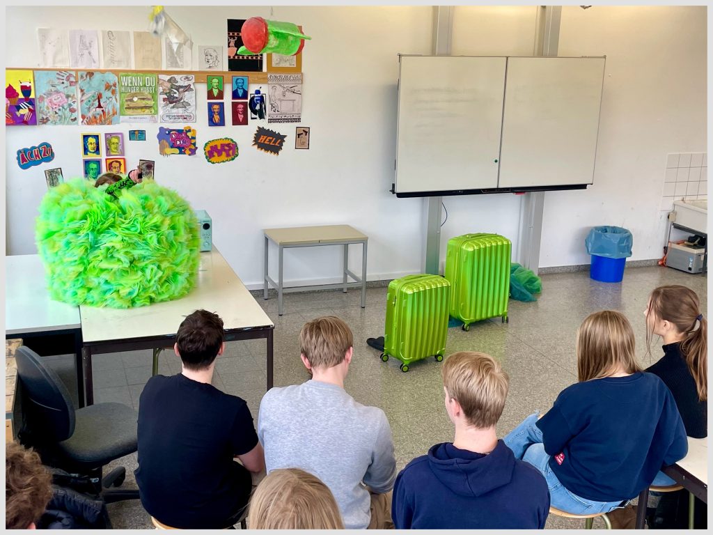Am 21. Februar 2024 wurde unser Schulalltag durch eine besondere Veranstaltung bereichert: Die Klasse 9a hatte im Rahmen des Deutschunterrichts die Gelegenheit, ein außergewöhnliches Theaterstück direkt in ihrem Klassenzimmer zu erleben, denn das Stadttheater Gießen war zu Gast. Mit Schauspielerin Dascha Ivanova präsentierte das Junge Theater das Ein-Personen-Stück „Popcorn oder Einsame Explosionen“ von Carina Sophie Eberle.