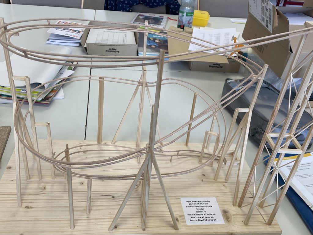 Insgesamt haben sich 12 Schülergruppen des 7. Jahrgangs entschieden, mit ihren Modellen bei der ersten Runde des Wettbewerbs auf Hessenebene teilzunehmen. Für den wörtlichen Feinschliff an den Achterbahnen investierten die Schülerinnen und Schüler dabei noch einmal einiges an (Frei-)Zeit.