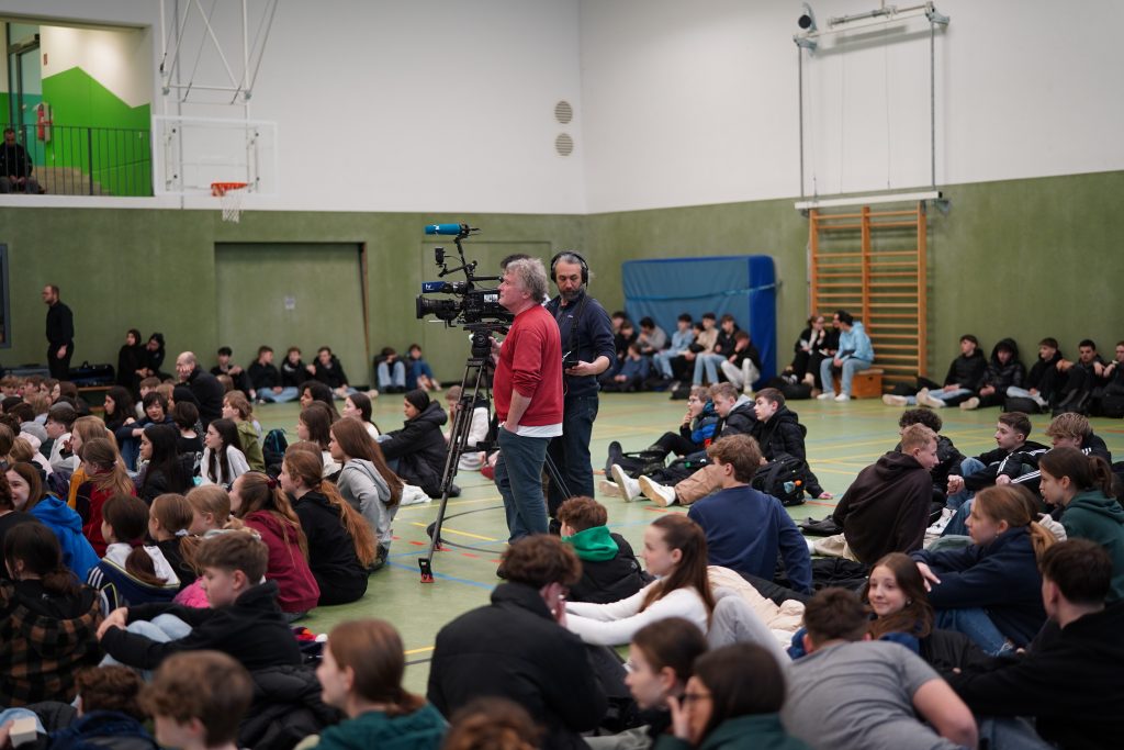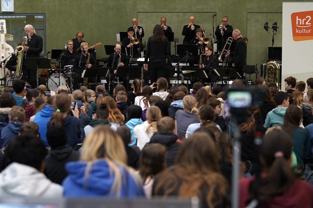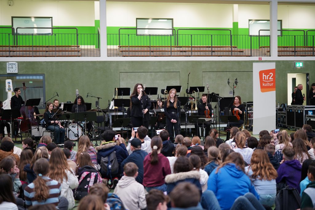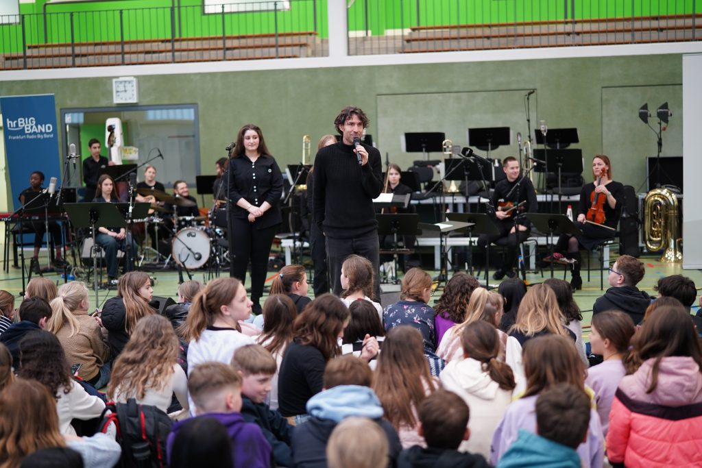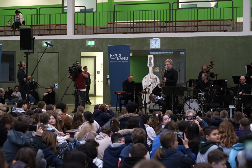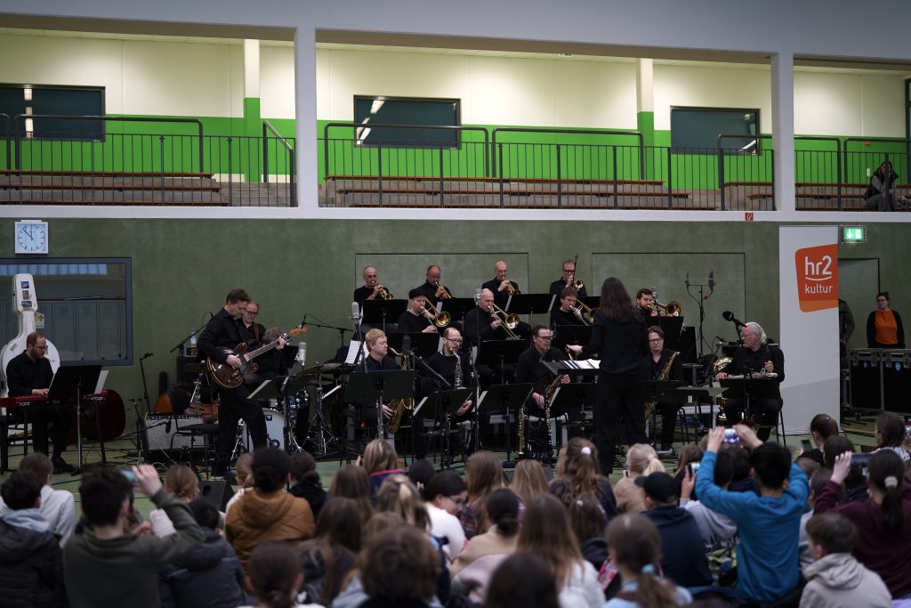 Am 05.03.2024 durften alle Schüler der Freiherrr-vom-Stein-Schule und einige Gäste der Schule an der Brühlsbacher Warte ein einstündiges Konzert der HR-Bigband erleben, das von einer achten Klasse der Schwingbachschule Rechtenbach moderiert wurde. Das Programm unter der Leitung der Saxofonistin Theresia Philipp setzte sich aus weitgehend flotteren Jazz-Standards zusammen, die von den hochkarätigen Musikern des HRs in bemerkenswerter Virtuosität und Perfektion dargeboten wurden. Als Vorband trat die Schulband „Gemstones“ der Freiherr-vom-Stein-Schule mit dem Adele-Song „Love in the Dark“ auf. Die beiden Frontsängerinnen Elina Muradjan und Mia Hoeberechts boten dabei einen stimmgewaltigen Auftritt der aufhorchen lies. Die Einstudierung hatte der Band-AG-Leiter Marcel Rudert übernommen, der zudem einen sehr gelungenen Streichersatz für die Nummer arrangiert hatte.