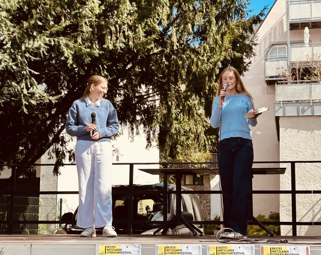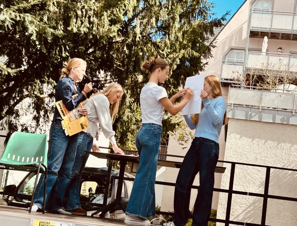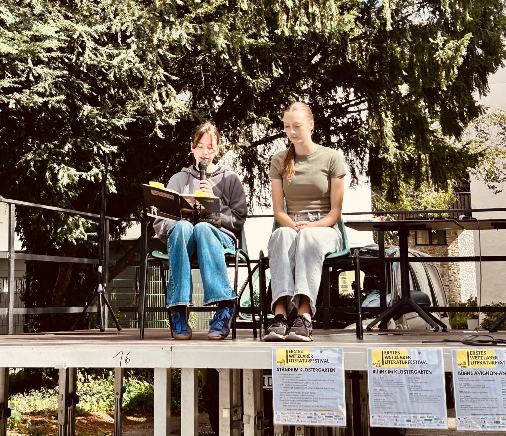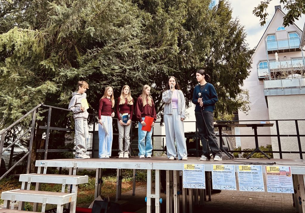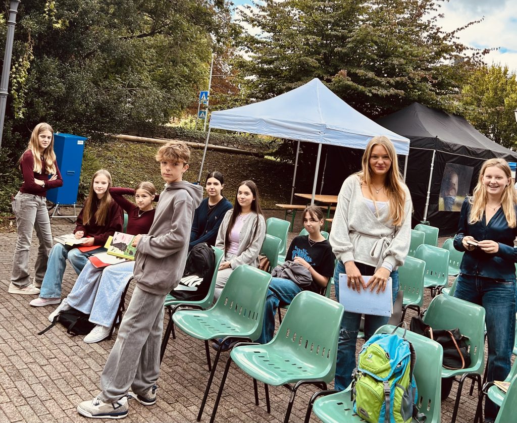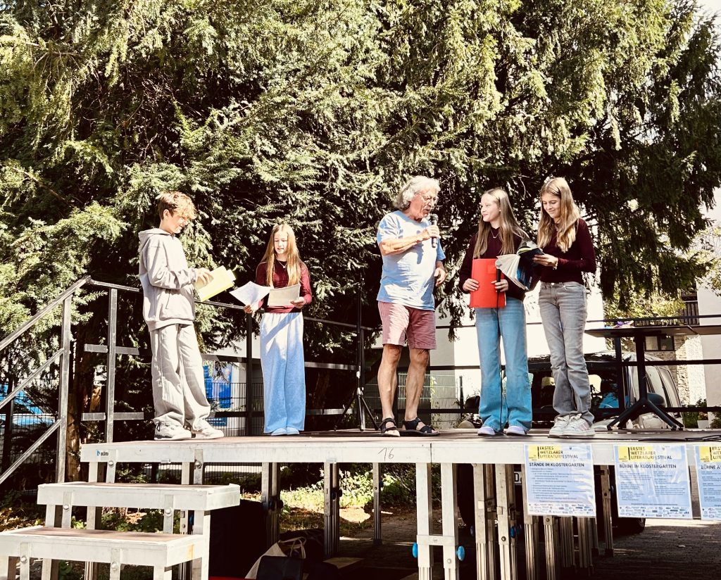 Die Schülerinnen des WU Kurses Darstellendes Spiel der Jahrgangsstufe 10 von Frau Schneider lasen aus gleich vier nominierten Titeln vor, darunter auch zwei Sachbuchtitel. Neben schauspielerischen Parts war es auch immer wieder das Publikum, das zum Mitmachen aufgefordert war – sei es beim Malen, Raten, dem Verfassen von kurzen Texten oder beim Vorlesen auf der Bühne im Klostergarten.