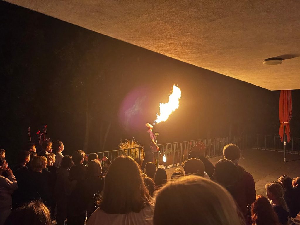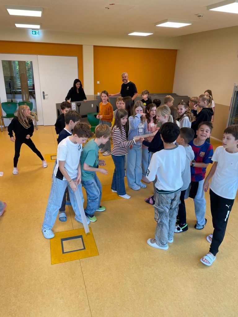 Nach einem gemeinsamen Frühstück im Klassenraum fuhren die Klassen mit dem Bus nach Waldernbach. Dort angekommen standen zahlreiche Aktivitäten auf dem Programm. Dabei mussten die Schülerinnen und Schüler Aufgaben gemeinsam im Klassenverband lösen. Neben der Überquerung des „Säureflusses“ bewiesen die Klassen ihre Geschicklichkeit und Teamfähigkeit am „Tower of Power“. Am Nachmittag durften die Steinschüler ihren Bewegungsdrang bei verschiedenen Sportspielen ausleben und gestalteten ihr eigenes Klassenplakat. Aufregend wurde es dann bei der Nachtwanderung durch den nahegelegenen Wald. Absolutes Highlight war für einige Klassen dann zum Abschluss das „Feuerspucken“.