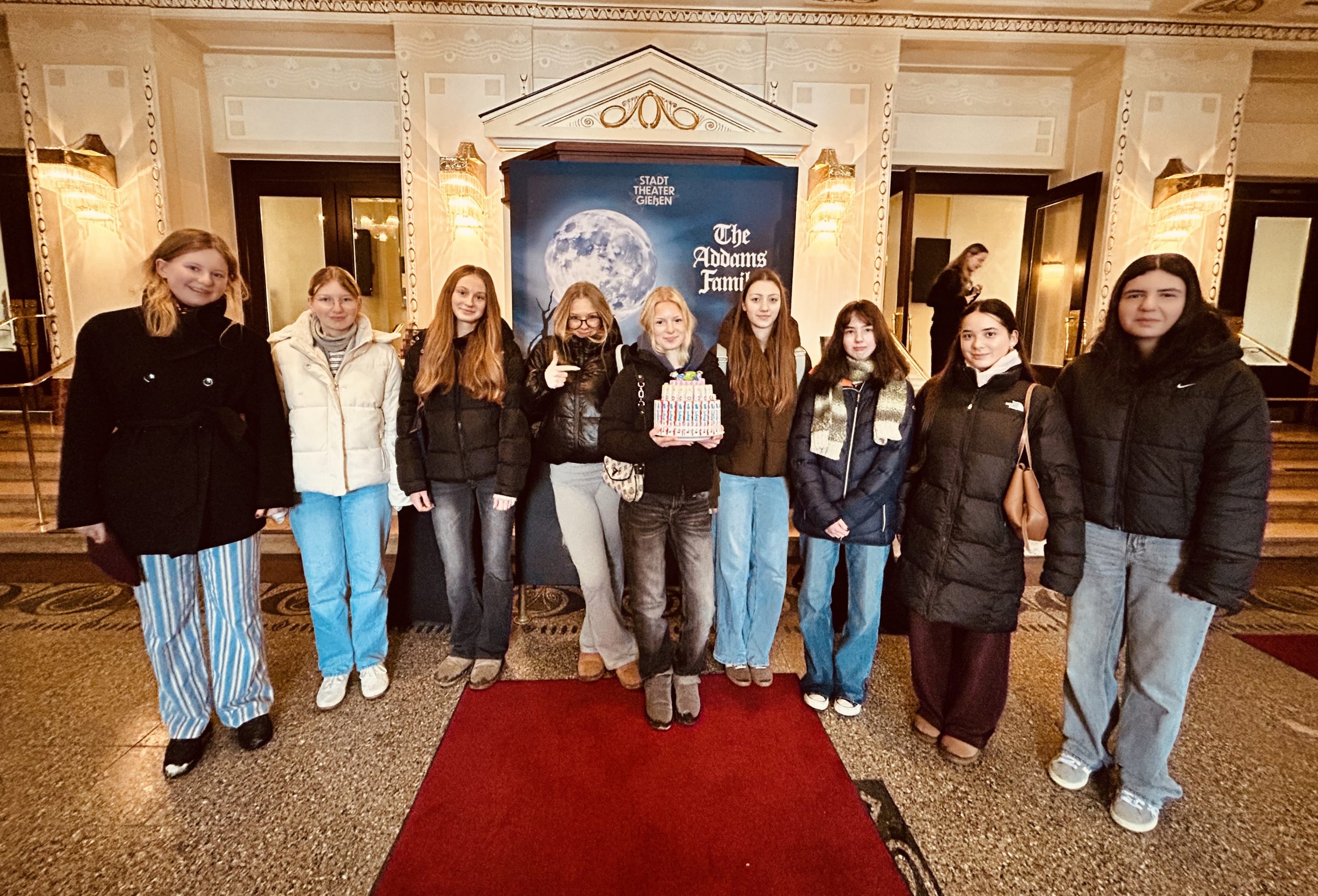Bei winterlichstem Wetter machten sich die Teilnehmerinnen des WU Kurses Darstellendes Spiel der Jahrgangsstufe 10 mit ihrer Lehrerin Tanja Schneider gemeinsam auf den Weg ins Stadttheater nach Gießen, um einer ganz besonderen Familie einen Besuch abzustatten: der Addams Family.