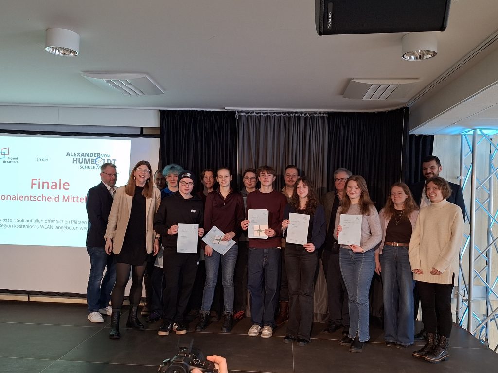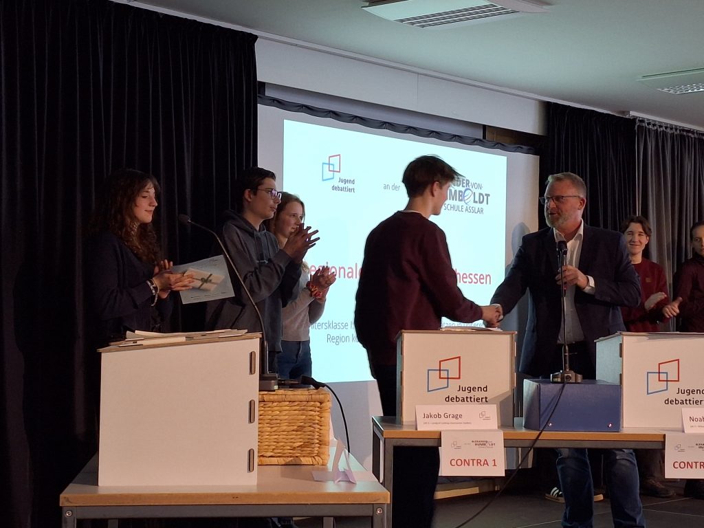 Unsere Schulsieger Konstantin Pausch, 9b, Johanna Ottofülling, 9a, und Benjamin Krakow, 9a, der als Nachrücker ebenso antreten musste, trafen in der Regionalqualifikation Mittelhessen in der Alexander-von Humboldt-Schule Aßlar auf 13 weitere Debattantinnen und Debattanten aus acht Schulen zu den Streitfragen „Soll für Privatgärten eine insektenfreundliche Gestaltung vorgeschrieben werden?“ und „Sollen für schriftliche Prüfungen in der Oberstufe Anwendungen mit künstlicher Intelligenz als Hilfsmittel zugelassen werden?“