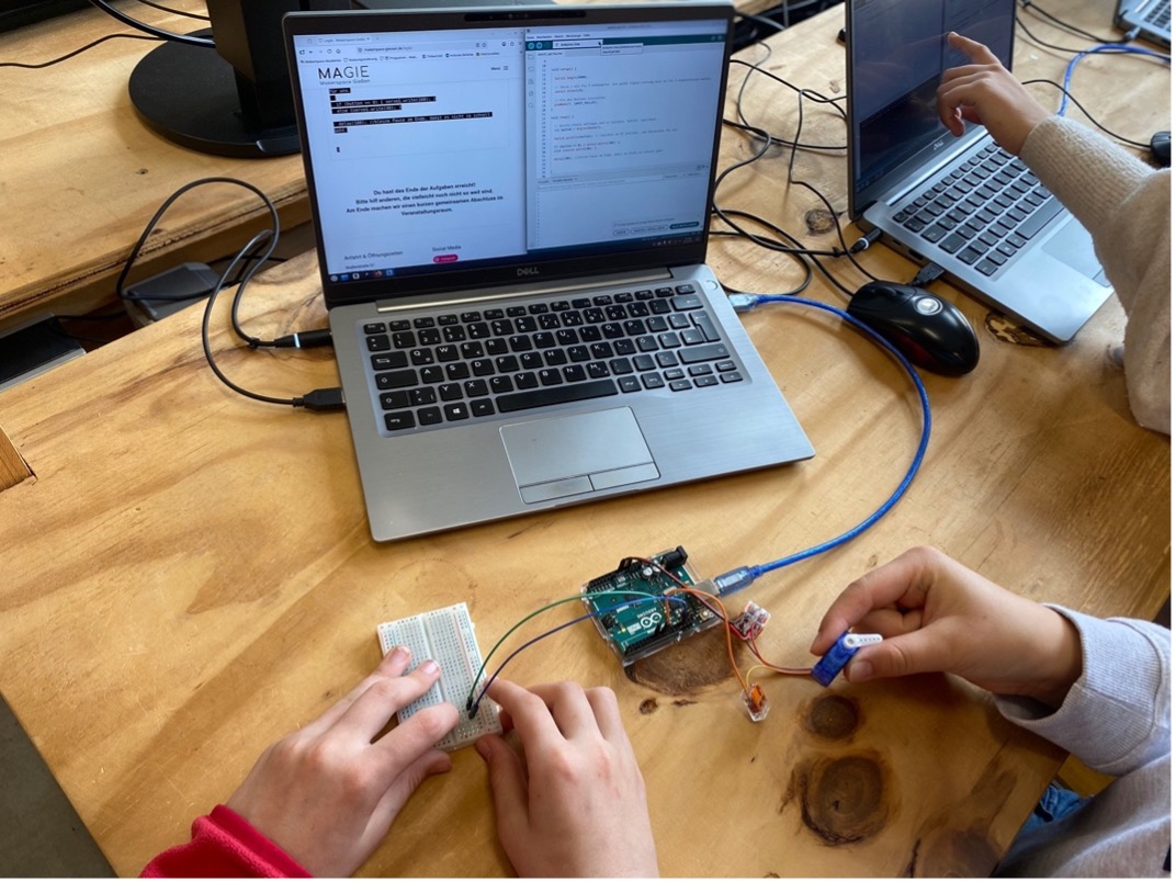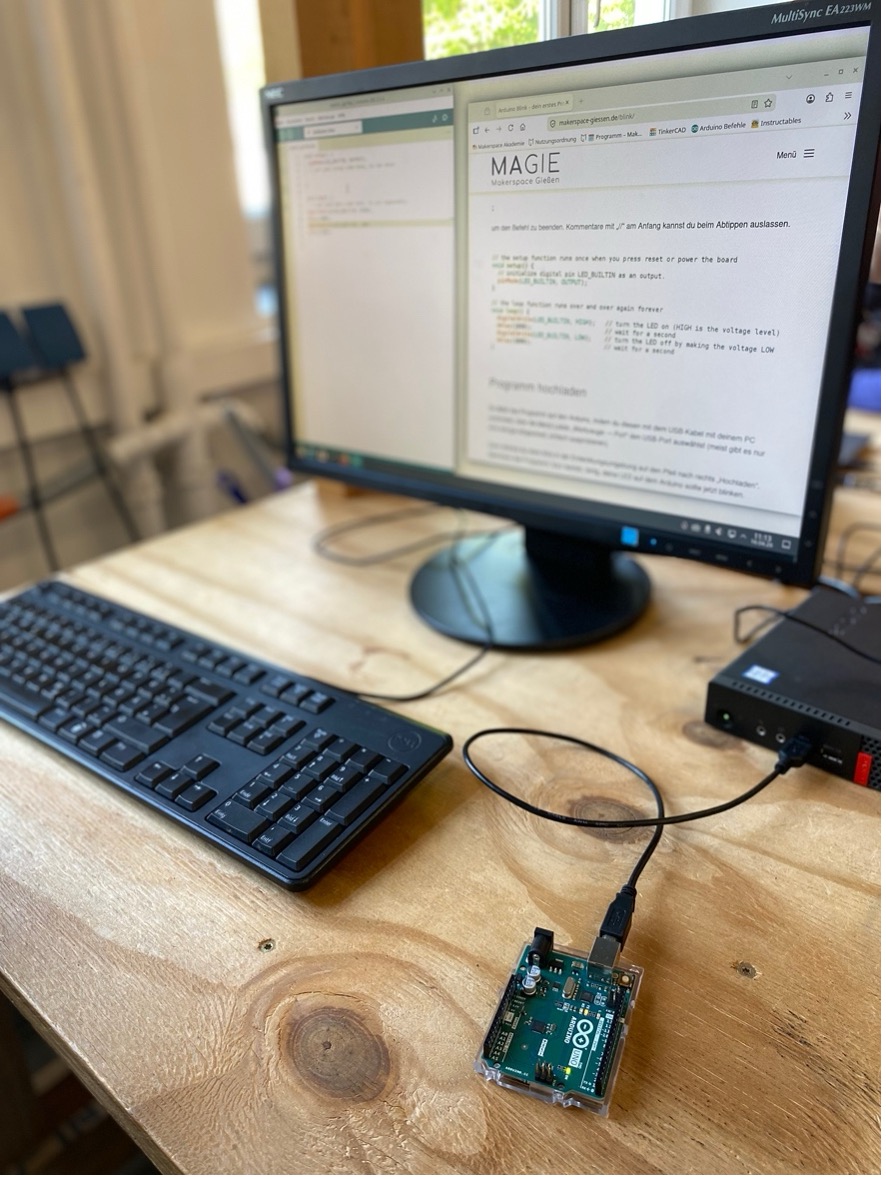 Zu Beginn erhielten die Schülerinnen und Schüler eine anschauliche Einführung in die Welt der Mikrocontroller. Dabei lernten sie den Arduino kennen, eine kleine, aber vielseitige Platine, mit der sich verschiedenste technische Projekte umsetzen lassen. Schritt für Schritt wurde erklärt, wie einfache Programme aufgebaut sind und wie man mit wenigen Befehlen beispielsweise LEDs zum Leuchten bringen oder Sensoren auslesen kann.