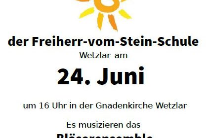 Herzliche Einladung zum Bläser-Sommerkonzert der Freiherr-vom-Stein-Schule am Samstag, den 18. Juli um 16 Uhr in der Gnadenkirche Wetzlar Büblingshausen. Es musizieren das Bläserensemble sowie die Bläserklassen 5 und 6. Der […]